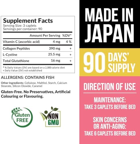 PREMIUM QUALITY, SAFETY ASSURED, MADE IN JAPAN: GMP Quality Assured, Non-GMO; SMALL, EASY-TO-SWALLOW: Take 3-6 caplets daily. For best results, consume daily before bedtime.