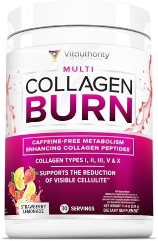 Multi Collagen Burn: Hydrolyzed Protein Peptides with Hyaluronic Acid, Vitamin C, SOD B Dimpless, Types I, II, III, V and X, Caffeine-Free Strawberry Lemonade Flavored 30 Servings