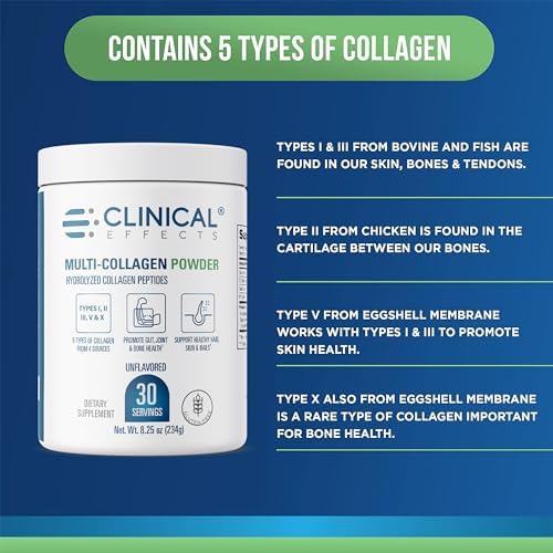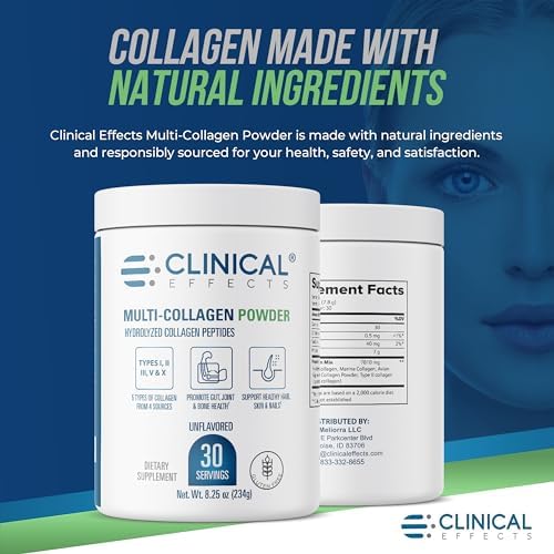 Clinical Effects Multi-Collagen Powder – Collagen Dietary Supplement – 8oz – 30 Servings – 5 Types of Quality-Sourced Multi-Collagen to Support Joint, Bone, Skin and Nail Health – Fast Absorption