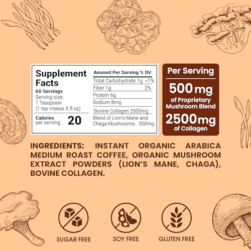 Collagen Mushroom Coffee Organic (60 Servings) Lion’s Mane, Chaga & Collagen, Mixed with Gourmet Arabica Instant Coffee | Mental Focus Boosting Coffee Plus Hair, Skin & Nails Health Support