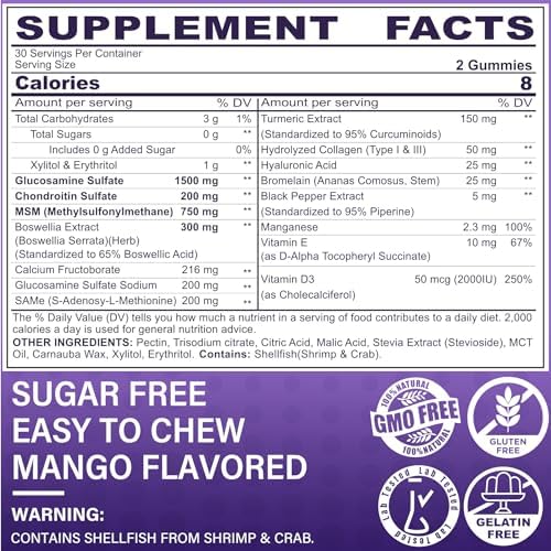 Sugar-Free Glucosamine Chondroitin Gummies: Our MSM Glucosamine Chondroitin supplement is a beneficial choice for both men and women, as it may help support cartilage formation, promote bone health, and protect connective tissue. Regardless of your age, it can assist in alleviating sti-ffness and discomfort, fostering a more vibrant and energetic lifestyle. Sugar-free, with a delightful mango flavor, no any unpleasant aftertaste, it is an ideal choice for adults looking to support j-oi-nt health.