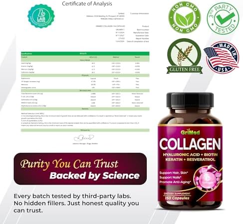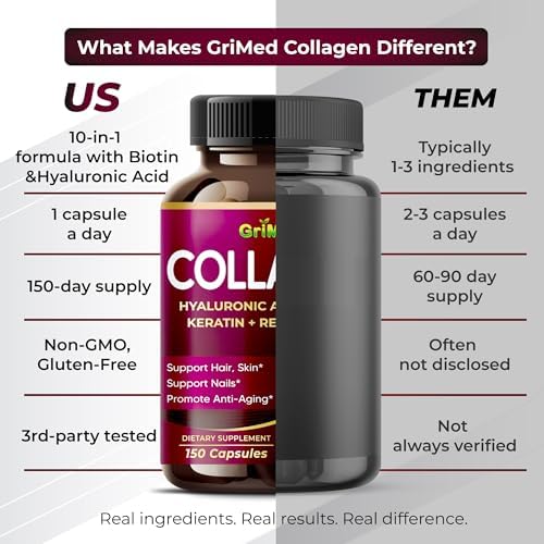 GriMed Organic Collagen 6,419 mg with Hyaluronic Acid, Biotin, Keratin, Resveratrol Hair Skin, Nails Vitamins – Made in The USA (150 Count (Pack of 1))
