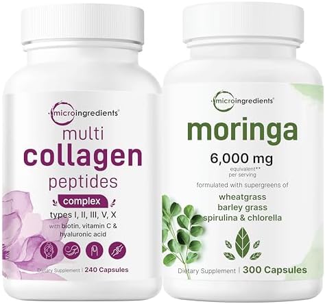 Micro Ingredients Multi Collagen Complex 240 Capsules & Moringa Oleifera 6,000mg Equivalent 300 Capsules Bundle 2 Pack | Hydrolyzed Protein Peptides | Antioxidant Supplement
