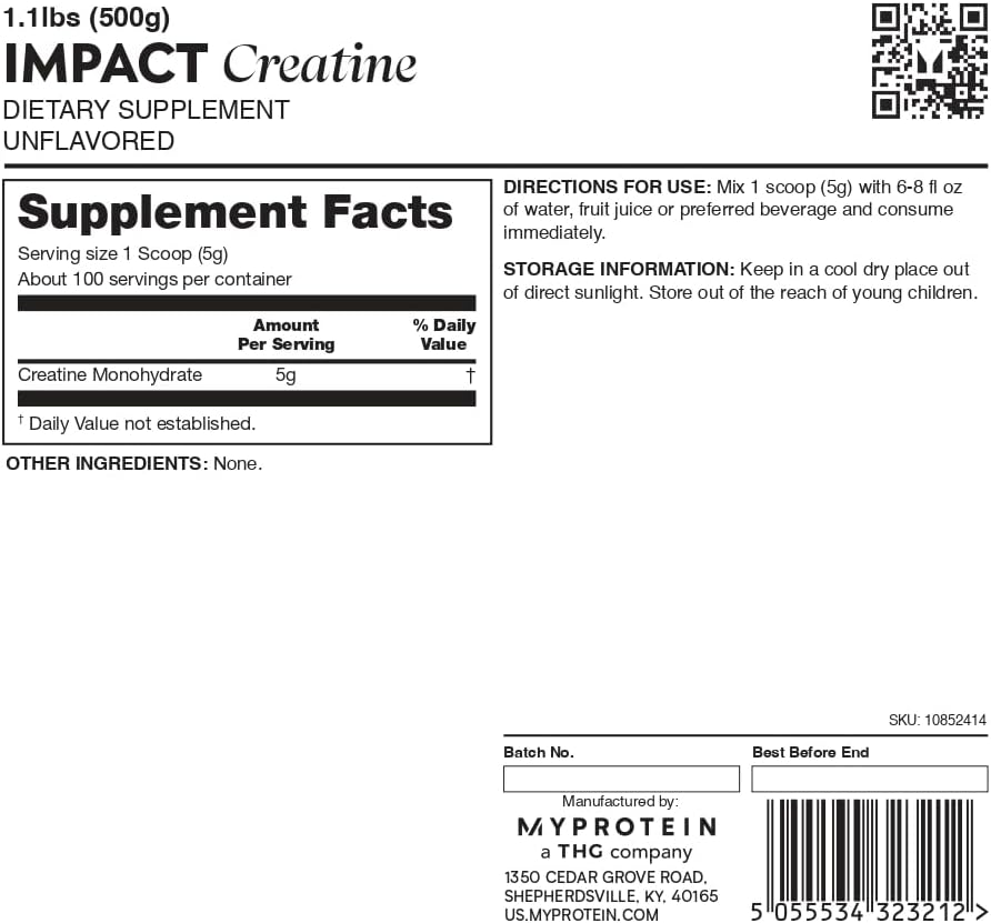 Myprotein Creatine Monohydrate Powder, 1.1lbs (100 Servings), Pure Unflavored Creatine Powder, Post/Pre Workout Supplement for All Sports & Exercises