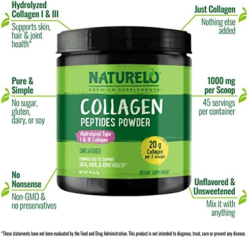 NATURELO Collagen Peptide Powder, Hydrolyzed Collagen Type I & III, Skin Hair & Joint Health – Unflavored, 16 Ounces | 45 Servings