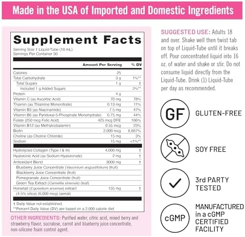 NatureWise Liquid Collagen provides a convenient and tasty way to incorporate skin-loving nutrients such as collagen, biotin, vitamin C, vitamin B complex, and folate into your daily routine. Infused with 4000 mg of high-quality type I and III collagen peptides, NatureWise Liquid Collagen adds more collagen to your system to support your hair, skin, and nails.* This Liquid Collagen also has a dose of 2000 mcg of biotin, an important vitamin that contributes to shiny hair and strong nails.* We also added a blend of B vitamins to give you a comprehensive B complex in every serving. B vitamins are especially important for energy metabolism and hair health.* Our liquid collagen contains vitamin B complex with thiamin (B1), vitamin B3, vitamin B6, biotin (B7), folate (B9), and vitamin B12. Vitamin C is critical for collagen synthesis, which is why the NatureWise Liquid Collagen is fortified with a boost of Vitamin C, to help you get the most out of every delicious drink. Flavored with pomegranate, blackberry, and blueberry juice for additional antioxidant support, you can enjoy this delicious mixed berry flavor without the sugar rush. Every serving only contains 1 g of sugar, meeting your health goals while turning your beauty routine into a fun drink.* Spruce up your beauty routine with NatureWise Liquid Collagen, a complete skin support supplement with collagen peptides, biotin, vitamin C, and vitamin B complex. Crafted with meticulous attention to quality and flavor, these tubes are designed to make collagen and biotin supplementation not just beneficial, but truly enjoyable. These Liquid Collagen tubes are non-GMO, gluten-free, low sugar, and do not contain wheat, soy, dairy, eggs, peanuts, shellfish, or fish.