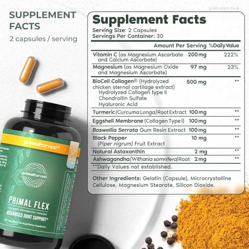 Primal Harvest, Primal Flex Joint Supplement with Collagen, Turmeric, Boswellia and Ashwagandha (60 Count) 1 Pack